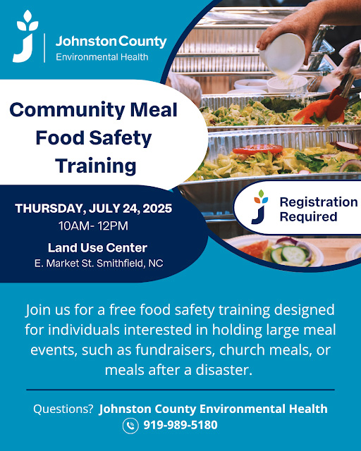 Smithfield, N.C.- Johnston County Environmental Health, a division of Johnston County Public Health, invites local nonprofits and community organizations to attend a free food safety training class on Thursday, July 24, from 10:00 a.m. to 12:00 p.m. at the Johnston County Land Use Center, 309 East Market Street in Smithfield.