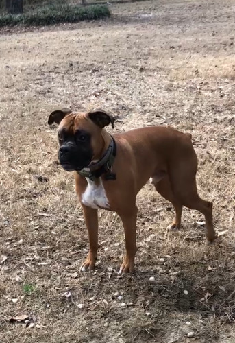 9 year old Boxer, about 55 pounds. All brown except white spot on chest. Very friendly