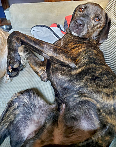 | Dark Brindle about 60 lbs , a discoloration from a hot spot on his snout, a knob on the top of his head and a small white patch on his chest. Hes got some grey fur on his muzzle, but still acts like a puppy. |