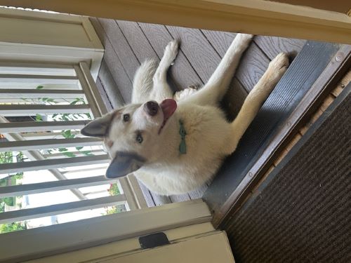 | Beautiful white thick fur like Shepard but different color eyes like Australian Shepard so sweet and loving wanted to go in house no real distinct marks except tan ears and tan spot in middle of ears on forehead |