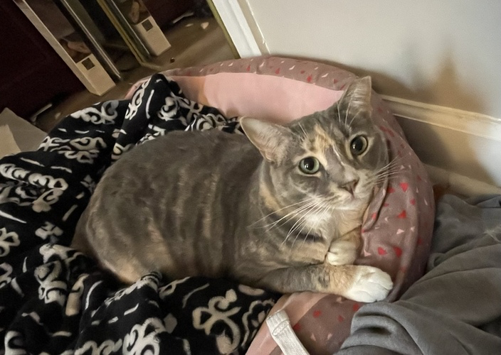 Description: | Gray cat with white belly and tip of left ear is clipped. |