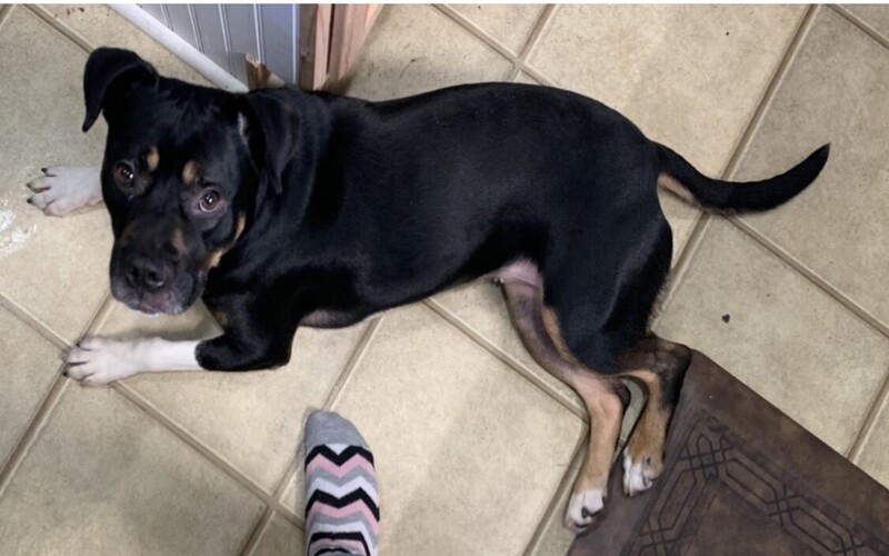 Description: | Female, spayed, mixed breed (has the look of an american staffy/boxer) dog about 50 lbs. Mostly black with a little brown on her eyebrows and some brown on the underside of her tail and a little on her legs. Front legs have white about half way up them and her back paws are white on the toes. Sweet dog but very energetic! |