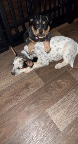 Description: | White and black male heeler puppy (12 weeks old) Tan & Black 9 week old female heeler puppy BOTH DOGS ARE MICROCHIPPED |