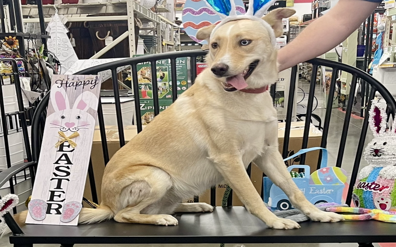 Description: | Wilda is a 3 year old, 62lbs husky X lab mix. She’s got a shaved back right leg and shaved left side of neck due to healing wounds from a coyote attack a couple of months ago. She has a blue left eye and brown right eye and is wearing her hot pink collar with a rose gold hexagonal tag. She’s got a white line up her nose with more white on her left side. She NEEDS her AM and PM meds. |