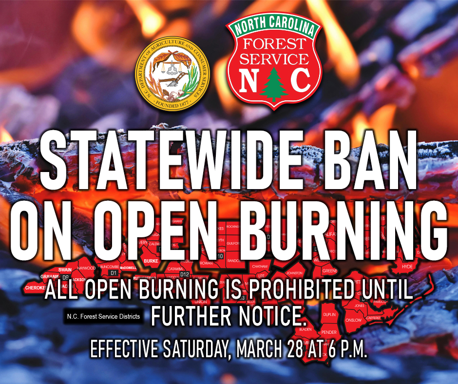 Due to increased wildfire risk, the N.C. Forest Service has issued a ban on all open burning and has canceled all burning permits statewide effective 6 PM Saturday, March 28 until further notice.