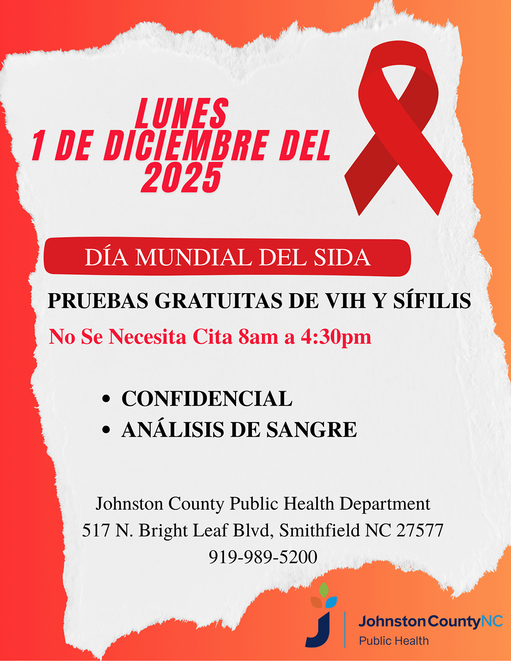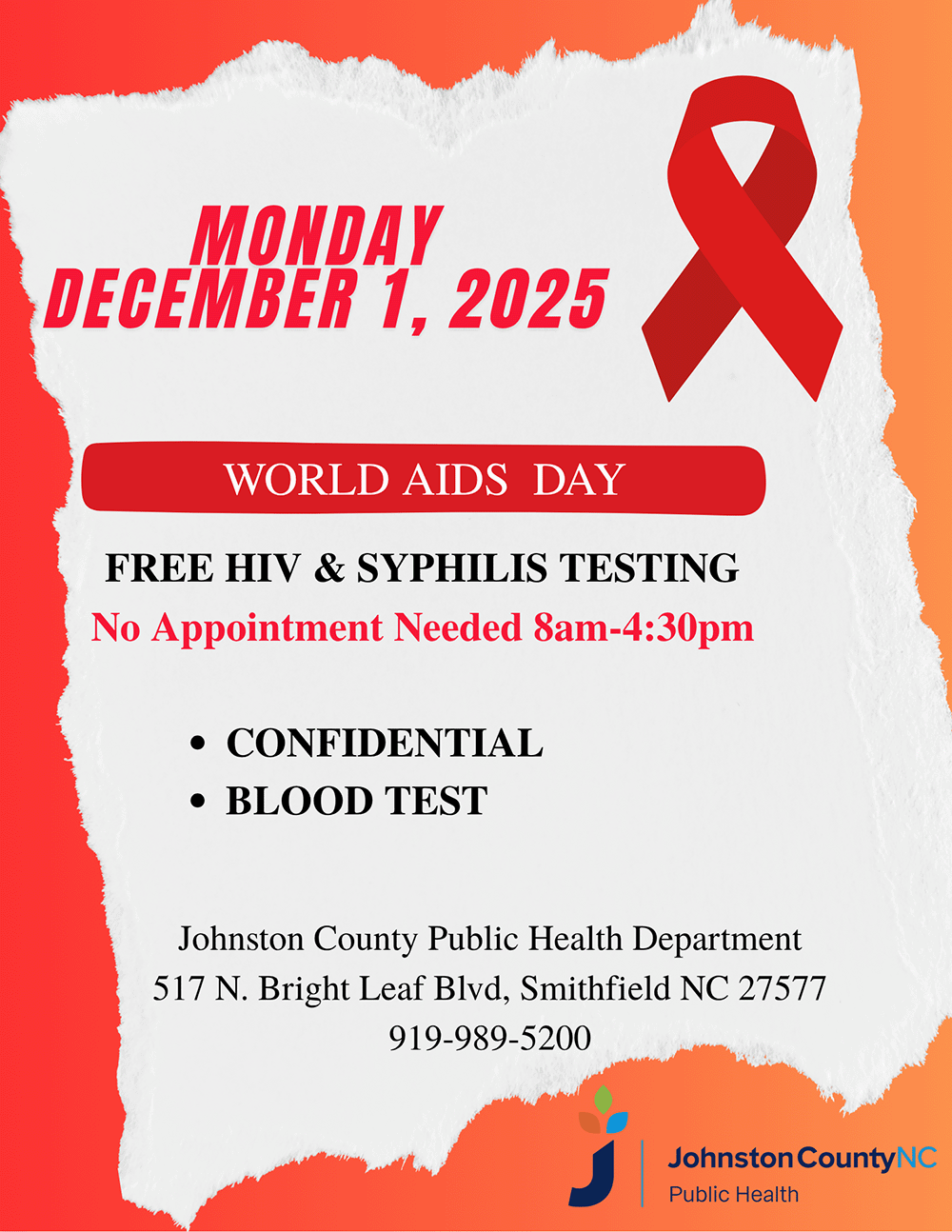 In observance of World AIDS Day on December 1, 2025, free HIV and syphilis testing will be offered from 8 a.m. to 4:30 p.m. at the Johnston County Public Health Department in Smithfield, NC. No appointment needed. Join us to help fight the spread of HIV.