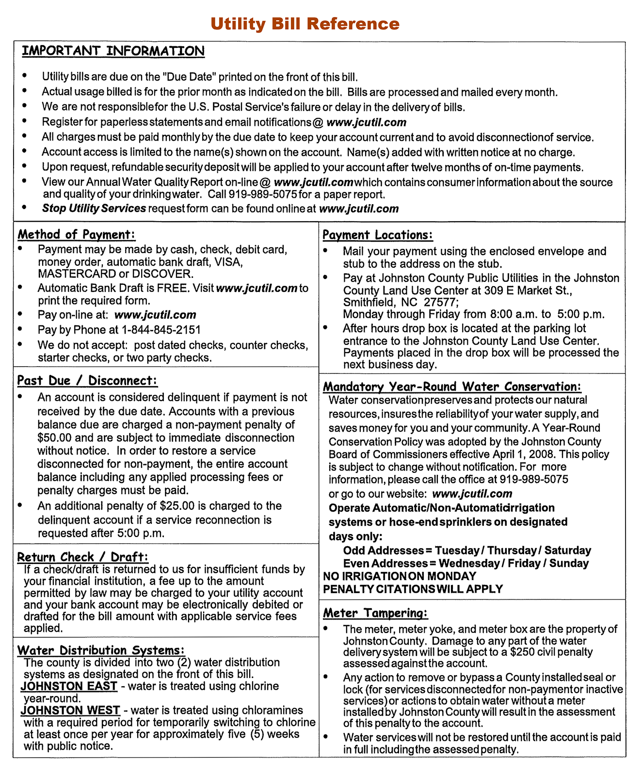 - Utility bills are due on the "Due Date" printed on the front of your bill.